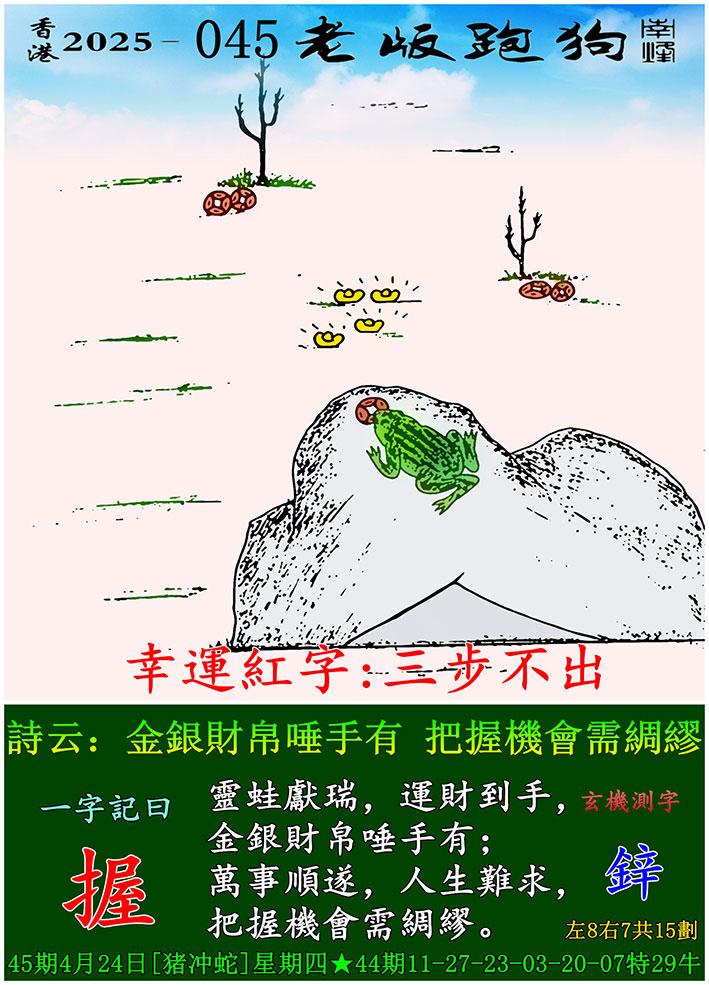 045期老版跑狗一字記之曰:【握】 詩雲:金銀財帛唾手有,把握機會需綢繆。