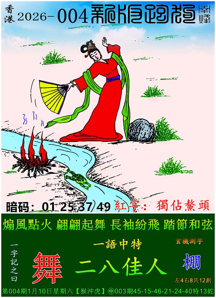 004期新版跑狗一字記之曰:【舞】 玄機測字:《棚》 一語中特:二八佳人