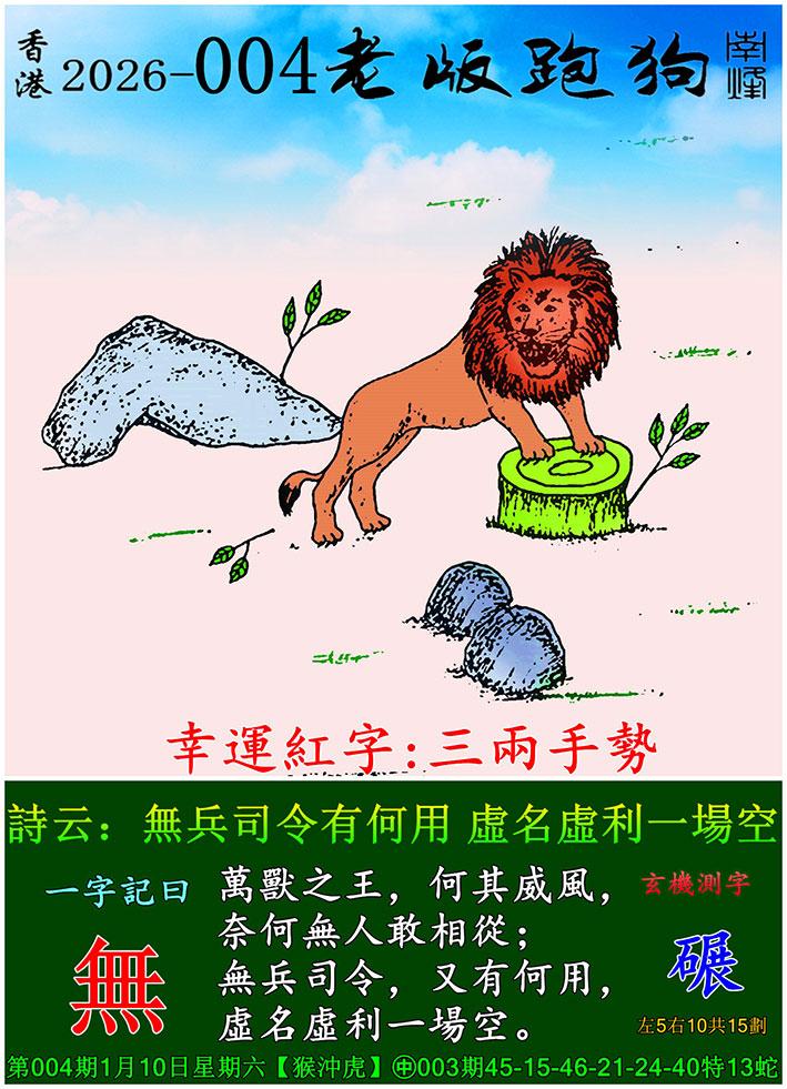 004期老版跑狗一字記之曰:【無】 詩雲:吳兵司令有何用 虛名虛益一場空。