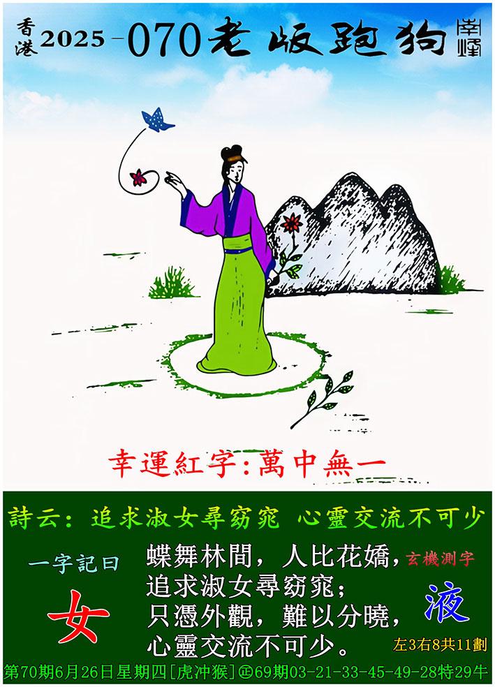 070期老版跑狗一字記之曰:【女】 詩雲:追求淑女尋窈窕,心靈交流不可少。