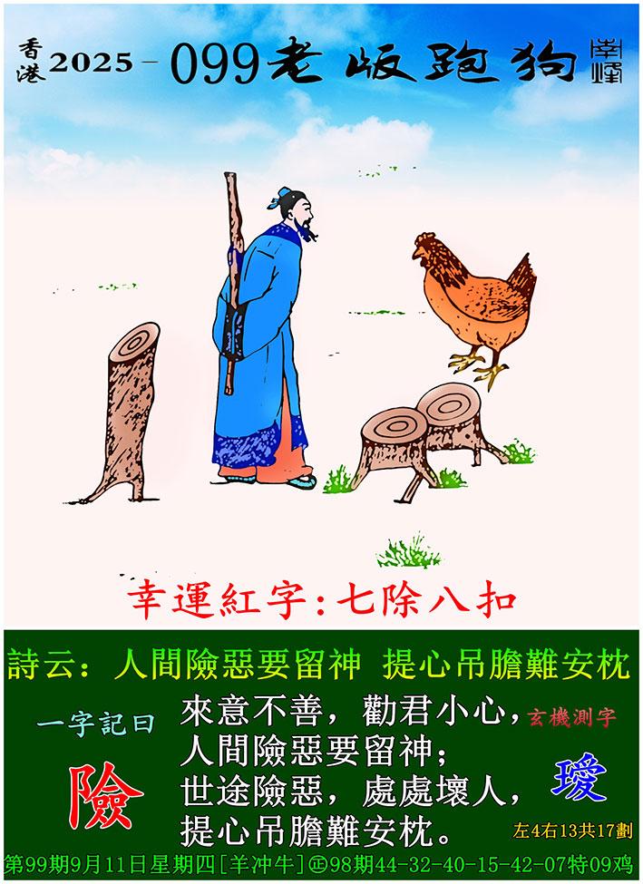 099期老版跑狗一字記之曰:【險】 詩雲:人間險惡要留神,提心吊膽難安枕。