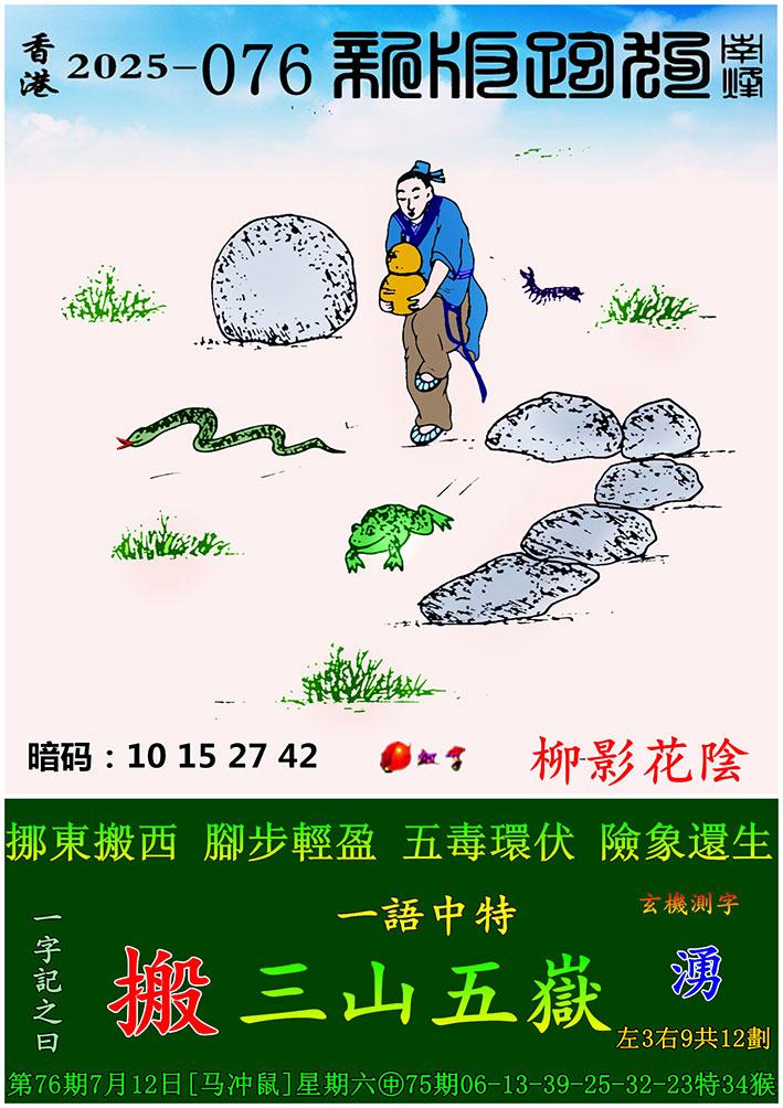 076期新版跑狗一字記之曰:【搬】 玄機測字:《湧》 一語中特:三山五嶽