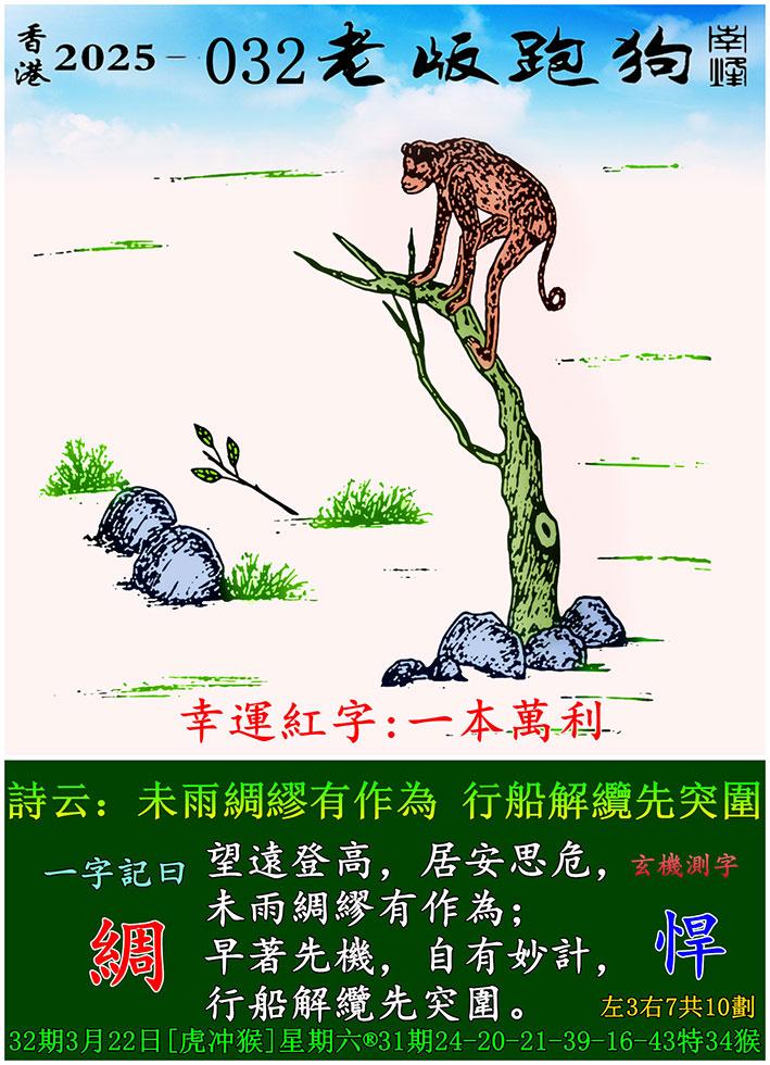 032期老版跑狗一字記之曰:【綢】 詩雲:未雨綢繆有作為,行船解纜先突圍。