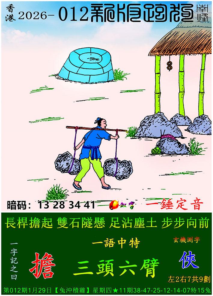 012期新版跑狗一字記之曰:【擔】 玄機測字:《俠》 一語中特:三頭六臂