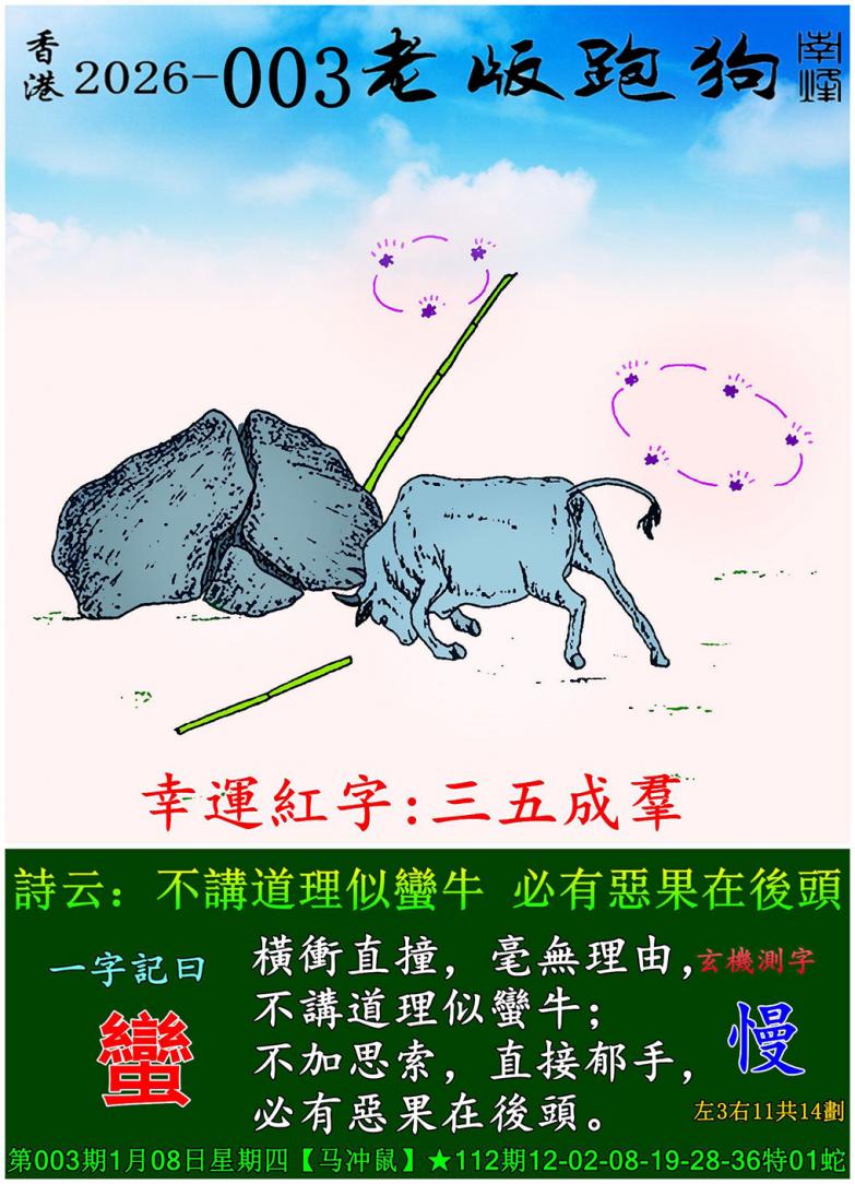 003期老版跑狗一字記之曰:【蠻】 詩雲:不講道理似蠻牛,必有惡果在後頭。