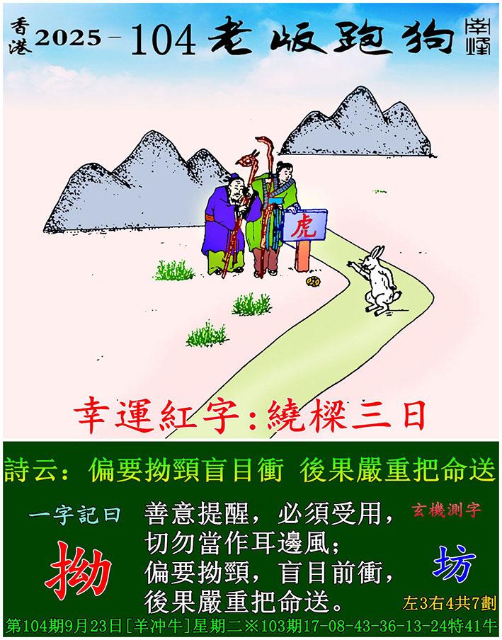 104期老版跑狗一字記之曰:【拗】 詩雲:偏要拗頸盲目衝,後果嚴重把命送。