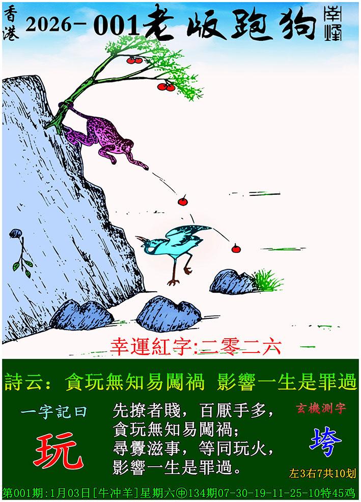 001期老版跑狗一字記之曰:【玩】 詩雲:貪玩無知易闖禍,影響一生是罪過。