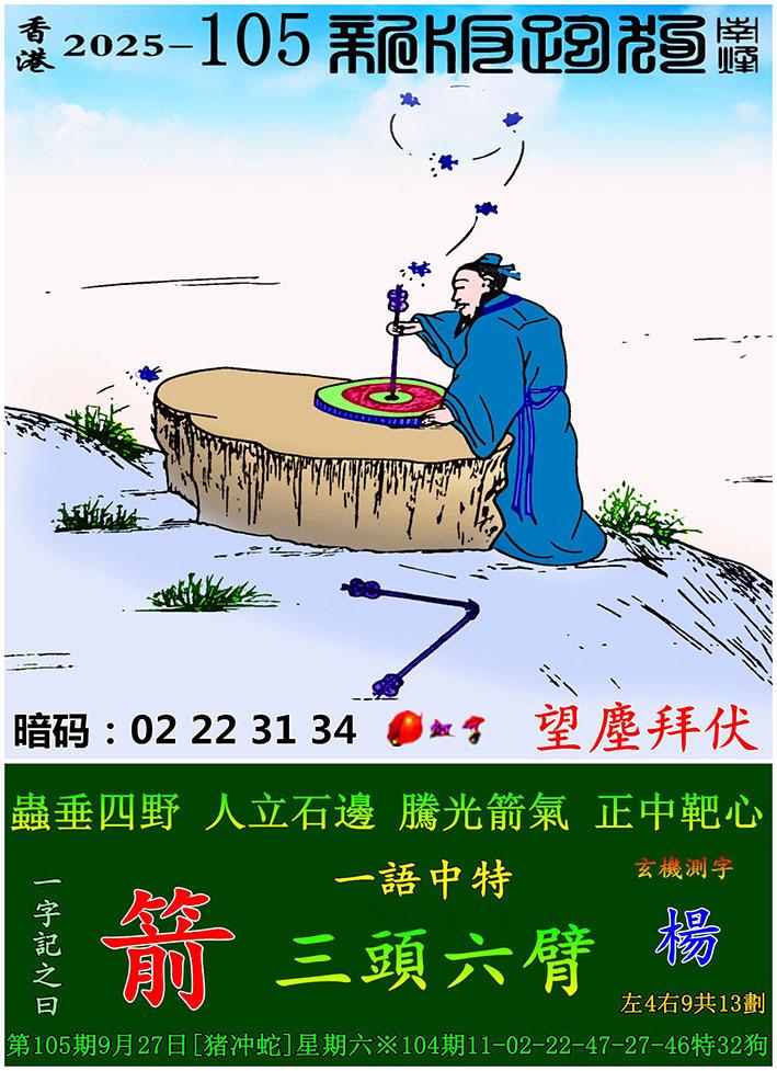 105期新版跑狗一字記之曰:【箭】 玄機測字:《楊》 一語中特:三頭六臂