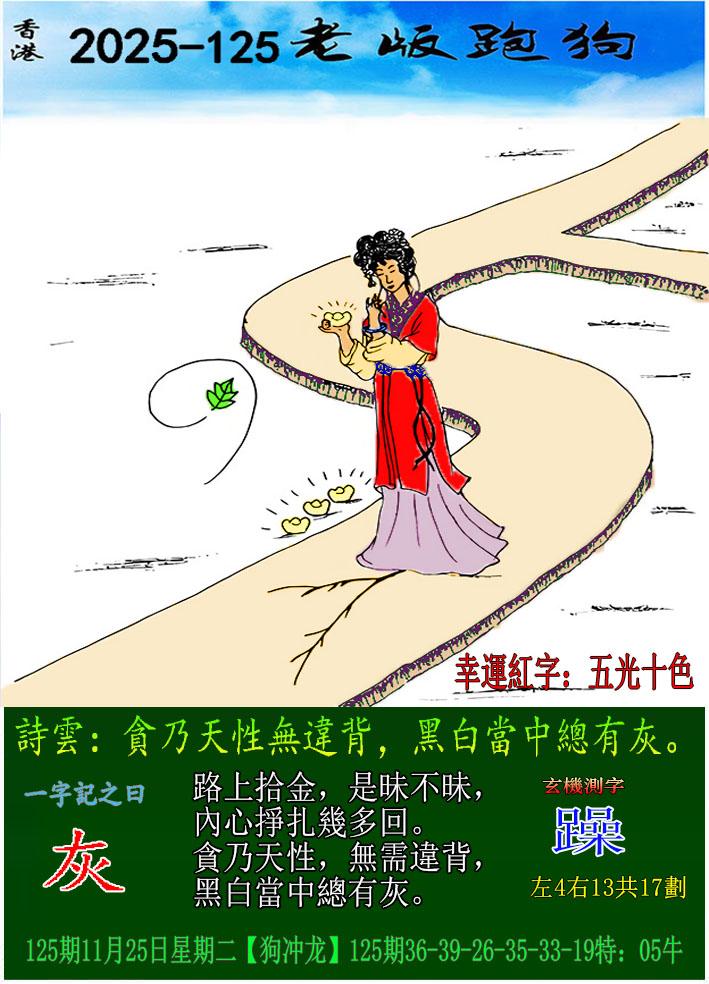 125期老版跑狗一字記之曰:【灰】 詩雲:貪乃天性無違背,黑白當中總有灰。